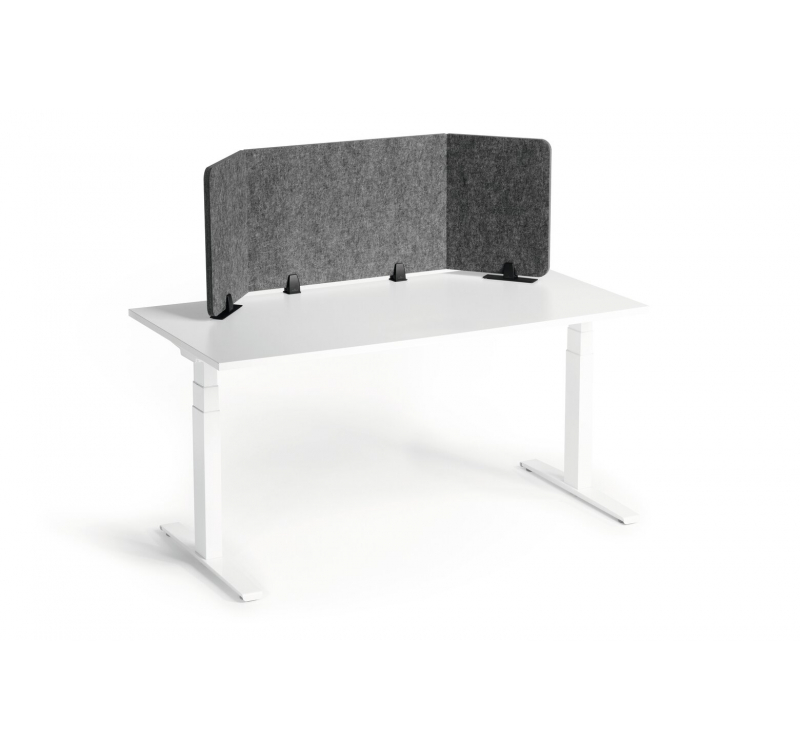 Divisorio da scrivania pieghevole realizzato con feltro in PET riciclato, offre una maggiore privacy e una migliora il comfort acustico della postazione di lavoro, l'angolazione del pannello da scrivania può essere regolata per adattarsi a ogni esigenza. Diverse modalità di fissaggio per adattarsi alle specifiche esigenze della postazione di lavoro, con morsetto o base da tavolo. cm 160Lx50Hx2P
