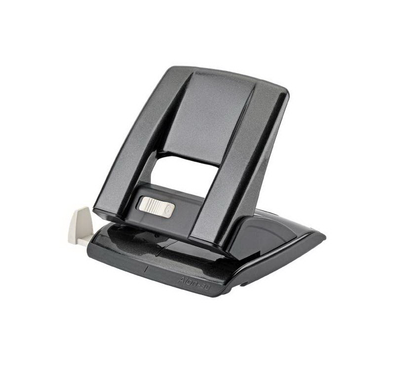 PERFORATORE IN LINEA Perforatore a 2 fori in metallo con guida regolabile ed inserti in abs. Di robusta costruzione, consente di perforare fino a 30 fogli con il minimo sforzo. Il meccanismo di sicurezza e salva spazio (blocco/sblocco impugnatura) ? pratico e veloce grazie al pulsante preposto posizionato sul fronte dell?impugnatura.Il vano raccoglicoriandoli ? facilmente svuotabile, senza rimuoverlo, attraverso la pratica apertura frontale dedicata. Nero Fogli 30 Colore Nero