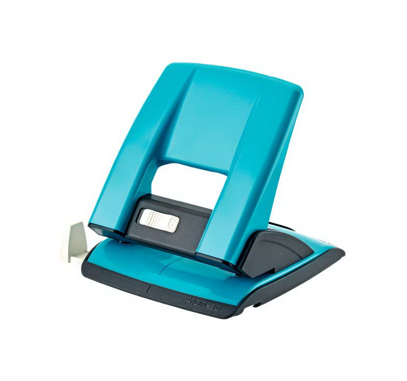 PERFORATORE IN LINEA Perforatore a 2 fori in metallo con guida regolabile ed inserti in abs. Di robusta costruzione, consente di perforare fino a 30 fogli con il minimo sforzo. Il meccanismo di sicurezza e salva spazio (blocco/sblocco impugnatura) ? pratico e veloce grazie al pulsante preposto posizionato sul fronte dell?impugnatura.Il vano raccoglicoriandoli ? facilmente svuotabile, senza rimuoverlo, attraverso la pratica apertura frontale dedicata. Turchese Fogli 30 Colore Turchese
