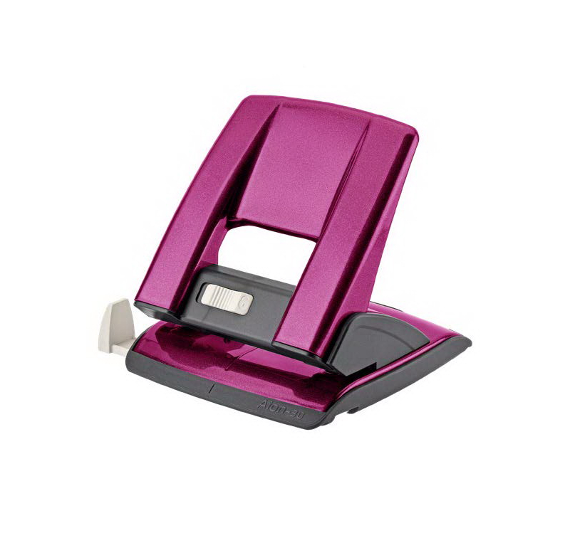PERFORATORE IN LINEA Perforatore a 2 fori in metallo con guida regolabile ed inserti in abs. Di robusta costruzione, consente di perforare fino a 30 fogli con il minimo sforzo. Il meccanismo di sicurezza e salva spazio (blocco/sblocco impugnatura) ? pratico e veloce grazie al pulsante preposto posizionato sul fronte dell?impugnatura.Il vano raccoglicoriandoli ? facilmente svuotabile, senza rimuoverlo, attraverso la pratica apertura frontale dedicata. Fucsia Fogli 30 Colore Fucsia